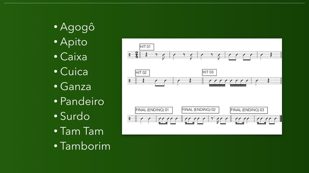 • 9 Instrumentos (Agogô, Apito, Caixa, Cuica, Ganza, Pandeiro, Surdo, Tam Tam, Tamborim)